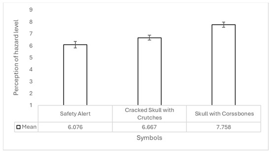 p < 0.001. In terms of numbers, ‘safety alert’ had the lowest average rating (M = 6.076) of any symbol. ‘Skull with crossbones’, on the other hand, received the highest ratings (M = 7.758). The order of perceived hazard, ranked from low to high, was as follows: safety alert, cracked skull with crutches, and skull with crossbones, as shown in