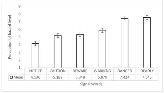 p < 0.001. In terms of numbers, ‘notice’ had the lowest average rating (M = 4.136) of any signal word. ‘Deadly’, on the other hand, received the highest ratings (M = 7.545). The order of perceived hazard rating, ranked from low to high, was as follows: notice, caution, beware, warning, danger, and deadly, as shown in