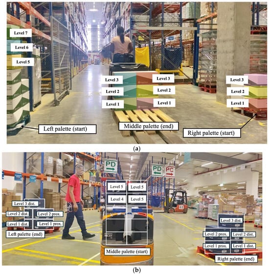 Additionally, the setup for each workstation scenario is illustrated in Figure 1. In both workstations, the workers started from a free-standing posture. Given the nature of the MHO, all tasks required trunk and back movements, with box placement occurring at various height levels, as detailed in Table 1. Both participants were free to choose the movements they employed in palletizing the boxes (e.g., squatting or forward leaning), ensuring that the task was performed under realistic conditions.