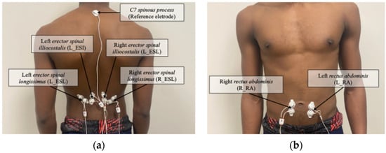 EMG data were collected bilaterally from the erector spinal Iliocostalis (ESI), erector spinal longissimus (ESL), and rectus abdominis (RA) using a wireless 8-channel biosignal Plux HUB® (PLUX Wireless Biosignals S.A, Lisbon, Portugal ) []. The rationale behind choosing these specific muscle groups stemmed from their functional significance during manual handling operations (MHO). Specifically, the erector spinal muscles were selected due to their role in trunk extension and stabilization [], while the RA muscles were chosen for their involvement in stabilizing the lumbar spine []. Furthermore, this selection process was informed by prior investigations assessing the efficacy of exoskeletons in MHO [,,]. The placement of electrodes was carried out according to the established Surface Electromyography for the Non-Invasive Assessment of Muscles (SENIAM) guidelines [], with an inter-electrode distance of 20 mm. A reference electrode was placed on the C7 spinous process. The locations of the EMG electrodes are shown in Figure 3. Data collection was performed using an 8-channel biosignal device with a sampling frequency of 1000 Hz, 100 GX input impedance, 110 dB common rejection factor, and 16-bit analog collection channels. Before experiments were conducted on each subject, the maximum voluntary contraction (MVC) values for each muscle were obtained. The subjects were instructed to perform three-second contractions for each muscle, with three-second intervals of rest between contractions. Data were processed using the MATLAB R2023a® software v9.14. The raw signals were amplified, filtered (high pass at 10 Hz and low pass at 450 Hz), rectified, and smoothed using the root mean square (RMS) digital algorithm. The EMG data (average values for each task) were normalized using the MVC.