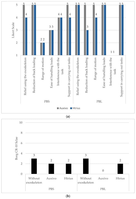 As previously mentioned, the sample considered in this study consists of two participants, each assigned to one of the workstations under analysis. Both participants had previous experience with the use of both exoskeletons. The PBS worker was a female, aged 26 years, with a weight of 80 kg and a height of 166 cm. The PBL worker was a male, aged 25 years, with a weight of 75 kg and a height of 186 cm. Figure 4 presents the questionnaire results, comparing the application of two exoskeletons, Auxivo and Htrius, across two picking methods, PBS and PBL. For Figure 4a. the Likert scale was considered, ranging from 1 (strongly disagree) to 5 (strongly agree). For Figure 4b, the Borg CR-10 Scale was considered, ranging from 0 (nothing at all) to 10 (extremely strong).