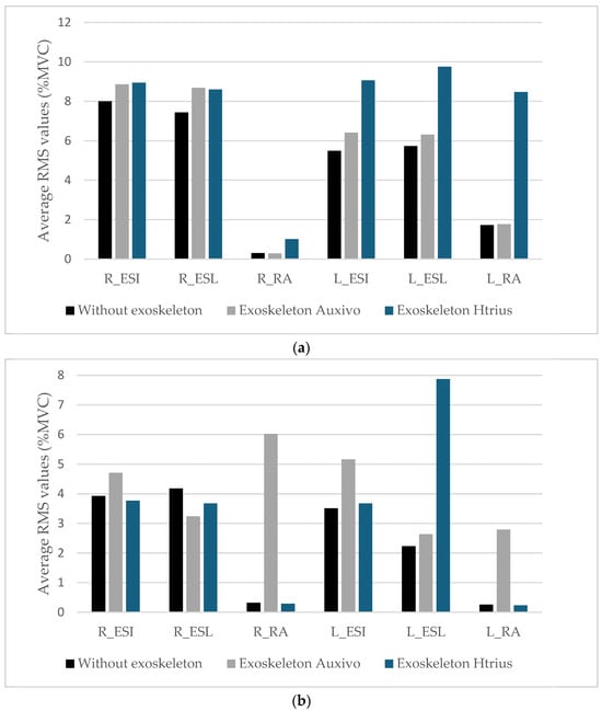 The findings for PBS (Figure 5a) indicate no substantial reduction in muscle activity when comparing the exoskeleton condition to the condition without exoskeletons, except for the R_RA muscle in the Auxivo exoskeleton condition, which exhibited a decrease of 6.6%. In PBL (Figure 5b), the results demonstrate notable reductions in muscle activity across conditions. The Auxivo exoskeleton condition, compared to the condition without an exoskeleton, showed a decrease in R_ESL muscle activity by 22.5%. Likewise, for the Htrius exoskeleton condition, compared to the condition without an exoskeleton, reductions of 4.1% in R_ESI, 12.0% in R_ESL, 9.4% in R_RA, and 11.5% in L_RA, were observed.