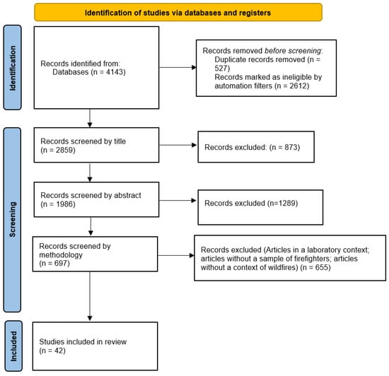 The selection of articles took place in three different phases. Initially, a search was carried out in the various databases, including the different filters, where each article was selected by title, keywords, and abstract. In the second phase of the research, all the articles selected in the previous stage were methodologically analysed, confirming compliance with the inclusion/exclusion criteria. The inclusion/exclusion criteria were that there were no age or gender restrictions, only articles that did not include samples of firefighters were included, articles with exclusively laboratory analyses were excluded, and articles that assessed the occupational exposure of firefighters in the context of forest fires or prescribed burns were accepted, as they represented occupational exposure situations in real scenarios and fire simulation scenarios with organic material. Articles that did not use samples of firefighters, articles about environmental pollution, articles about other types of fires, and articles about animals or sick people were excluded. In the third and final stage of the research, the snowballing technique was applied to ensure that as many articles as possible were included in the review. The entire analysis was carried out by two authors in an independent blind round, with a third author responsible for resolving inconsistent decisions.