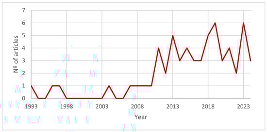 The distribution of included articles throughout the years reveals a peak in this research field in 2019. Conversely, from 2008 to the present day, there has been significant progress in the studies within this research area, as illustrated in Figure 2.