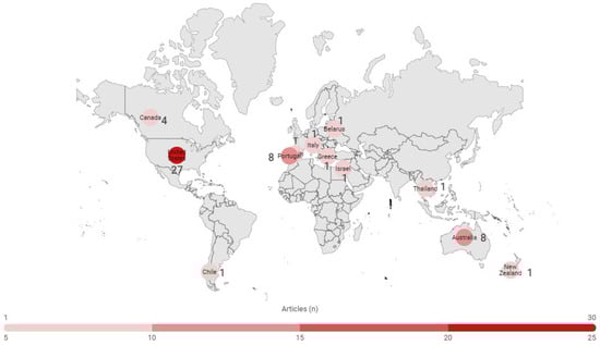 Nevertheless, the United States is leading in advancing firefighter health and safety, with 27 contributions [,,]. Notably, it is renowned for being among the most advanced countries in innovation, new methodologies, and implementing novel safety measures. Australia is another country that has made significant strides in this scientific domain, with eight notable contributions which began to gain momentum in 2011. This heightened progress may be attributed to the increasing severity of wildfires in recent years. Portugal demonstrated a high evolution in this study theme and presented eight articles about chemical agents and their impacts on wild firefighters’ health, as illustrated in Figure 3.