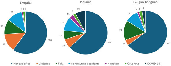 In most reports drafted by the emergency department, the cause of injury was not specified. Thus, without considering the unspecified cases, commuting accidents were the most frequent cause of injury (10.7%). The least frequent causes were handling and crushing. As shown in Figure 1 and in Table 3, the most common cause of injury was significantly different for each area (p < 0.0001): violence for the L’Aquila area (13.9%); commuting accidents for the Marsica area (10.3%); and falls for the Peligno-Sangrina area (14.8%) (Table 3).