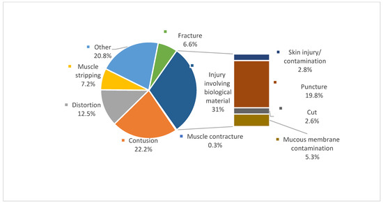 Another significant datum concerns the types of injuries; in fact, 30.5% of these injuries were associated with biohazards. In particular, of the overall injuries, 5.3% were from mucous membrane contamination; 2.8% were from skin contamination; 2.6% were from cuts; and 19.8% were from needlesticks. Partially comparable research points out that biohazards represent a major issue in occupational prevention and control in the healthcare sector [20]. In accordance with our findings, a puncture is considered the most common biologically related injury. With regard to the remaining types of injuries identified in our study (Figure 2), a recent study [21] confirmed that muscular issues, distortions, and fractures are frequent among healthcare workers.