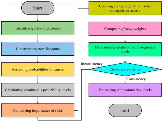 This section presents a novel methodology integrating FTA and fuzzy AHP to analyze risks in tunnel construction. The proposed method offers a comprehensive analysis for evaluating risk probabilities and consequences, thus enhancing precision and accuracy in risk assessment. The details of the proposed method are given below (see also Figure 1):