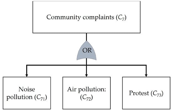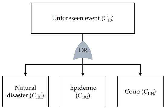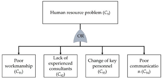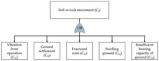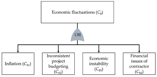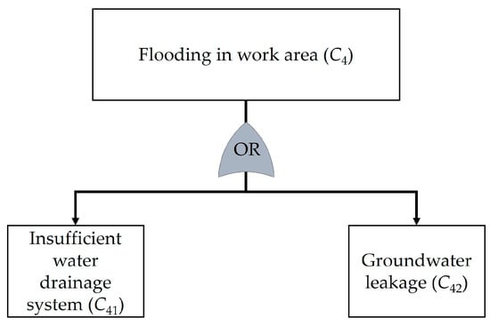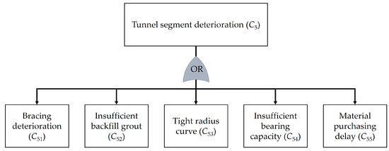 This section presents the outcomes regarding the analysis of risks in the context of underground tunnel construction using TBMs. The proposed method was applied to a case study of the Purple Line construction project, the Tao Poon–Rat Burana section. A total of 60 decision-makers were involved in this study. The participants were divided into two distinct groups. The first group comprised 30 experts from academic institutions or government agencies, each possessing specialized knowledge in underground construction. The second group comprised 30 field practitioners actively engaged in the underground construction project. These participants were carefully selected to provide a comprehensive understanding and diverse perspectives for the current study. The risks and the causes of these risks were identified through literature review and interview, as follows: insufficient tunneling (C1), deterioration of TBM (C2), soil or rock movement (C3), flooding in work area (C4), tunnel segment deterioration (C5), inappropriate working conditions (C6), community complaints (C7), economic fluctuations (C8), human resource problem (C9), and unforeseen event (C10). The relationships between the risks and their causes were identified as presented in Figure 3, Figure 4, Figure 5, Figure 6, Figure 7, Figure 8, Figure 9, Figure 10, Figure 11 and Figure 12. Obviously, the relationships can be represented by the OR gates that indicate the scenarios where the risks occur if one or more of the causes occur. This signifies that multiple independent or dependent events can cause the risk.