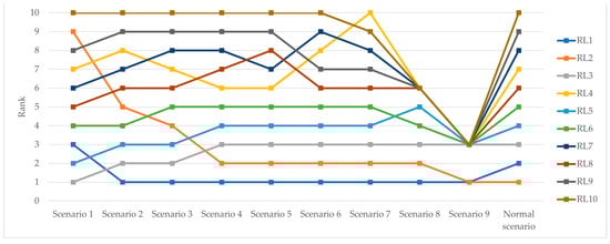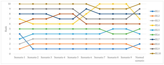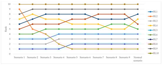 To accommodate various unexpected circumstances, it is necessary to conduct sensitivity analysis, which involves experimentally altering the values of the most significant parameter. In this study, the sensitivity analysis includes three experiments: changes to the highest probability, changes to the greatest weight, and changes to the highest probability and the greatest weight, while the other parameters are adjusted to optimal ratios [19,47]. Each experiment includes the normal scenario and nine additional scenarios. The new ranks of each risk were examined to check the robustness of the results. The sensitivity analysis results are shown in Figure 13, Figure 14 and Figure 15. The sensitivity results showed that changes in probabilities, weights, or both significantly affect the risk levels. Any alteration in parameter values resulted in corresponding changes in risk levels. For scenarios 8 and 9 in experiment 3, some risks are in the same ranks. These situations were simulated solely to demonstrate the sensitivity of the proposed method; it is impossible for these situations to happen in real-life scenarios. Furthermore, the sensitivity of results to different aggregation rules was checked. The proposed method was validated by aggregating the decision-makers’ judgments on the importance levels using the arithmetic mean. It can be found that although there has been a change in the method of totaling the decision-maker’s judgments, the ranks of risks have not changed. This ensures that our assessment of the risks remains accurate and is not affected by the change in the aggregation method. Therefore, we can conclude that the proposed method effectively responds to dynamic situations.