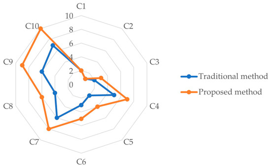 Furthermore, the proposed method was compared with the traditional calculations of probability and consequence levels proposed by Hyun, Min, Choi, Park, and Lee [35]. Herein, the calculations of probabilities and weights followed the proposed procedures. However, interpreting these probabilities and weights to determine the probability and consequence levels did not rely on continuous values, as shown in Table 9. Next, the discrete levels of each risk were calculated by multiplying the discrete probability and consequence levels. For example, the discrete PL1 equals 2 due to an RP1 of 0.39; the discrete CL1 equals 4 due to a w1 of 0.14; therefore, the discrete risk level of C1 (DRL1) = 2 × 4 = 8. Similarly, the DRLs of the others are DRL2 = 12, DRL3 = 8, DRL4 = 3, DRL5 = 8, DRL6 = 6, DRL7 = 2, DRL8 = 4, DRL9 = 2, and DRL10 = 1. Then, the ranks of each risk derived from the DRLs were determined in descending order and compared with the continuous risk levels, as presented in Figure 16.