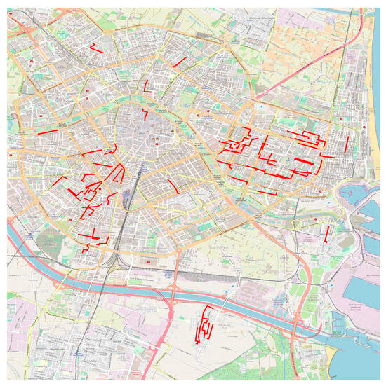 Figure 1. Spatial distribution of audited routes (in red) in the city of Valencia, Spain. Data source of base map: OpenStreetMap contributors (https://www.openstreetmap.org). Created using QGIS 3.28 software (https://www.qgis.org).