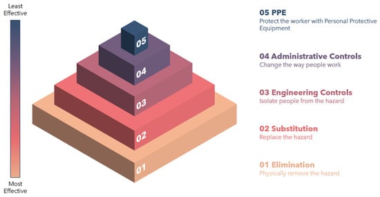 - National Institute for Occupational Safety and Health (NIOSH). Hierarchy of Controls; Centers for Disease Control and Prevention (CDC): Atlanta, GA, USA, 2023. Available online: https://www.cdc.gov/niosh/topics/hierarchy/default.html (accessed on 12 November 2023).