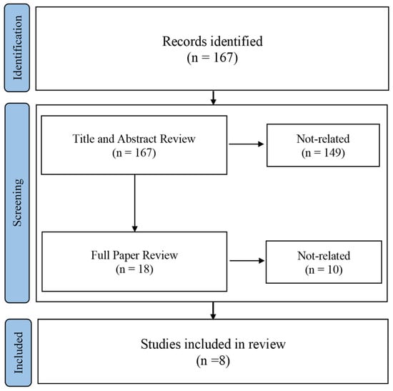 The initial review encompassed an examination of the research title and keywords, and this examination of the identified 167 papers determined that all papers were deemed relevant to the topic, as shown in Figure 2. A content analysis was performed by examining the papers’ titles and abstracts. This process revealed that only 18 papers discussed PtD barriers and other papers focused on different topics related to PtD. Then, the identified 18 papers were thoroughly reviewed. The review included multiple aspects of the paper, such as the research methodology, results, findings, and conclusion sections. This revealed that only eight papers discussed PtD barriers. Accordingly, these eight papers were extensively reviewed to produce a list of PtD barriers. It is important to note that the research team did not control the final number of papers; instead, the research question dictated which articles were to be included in the final review.