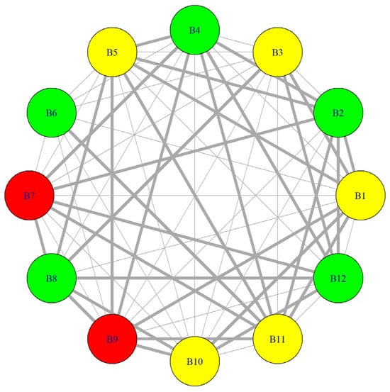 The second step in this phase was conducting a social network analysis (SNA) to visualize the relationships between the identified barriers and references. This technique aids in comprehending both barriers that have been extensively studied and those that have not. Conducting SNA starts with creating an incidence matrix, a binary matrix representing the relationship between two sets of nodes. In this way, this study illustrates the connection between references and barriers based on the information presented in Table 1. Accordingly, barrier frequencies were calculated to determine how often each barrier is mentioned across all references. Then, a bipartite graph was created to visualize relationships between references and barriers. Bipartite graphs are usually used to understand and analyze the relationships between two different types of entities; see Figure 3. The nodes in Figure 3 represent the identified impeding barriers. In contrast, the edges (i.e., connections) between the nodes represent the number of articles that mention the barriers. A thicker edge means that the two connected barriers are mentioned together more often, and vice versa.