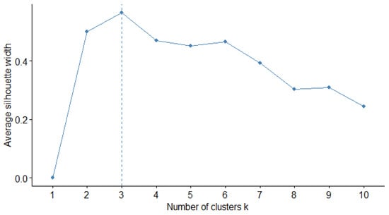 The optimal number of clusters. The dashed line in the figure represents the intersection between the number of clusters and the average silhouette width.