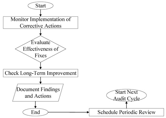 The process of physical security audit follow-up is demonstrated in Figure 4. It guides the management of the ongoing security posture of electric power substations, emphasizing the importance of continuous monitoring, evaluation, and planning for future audits.