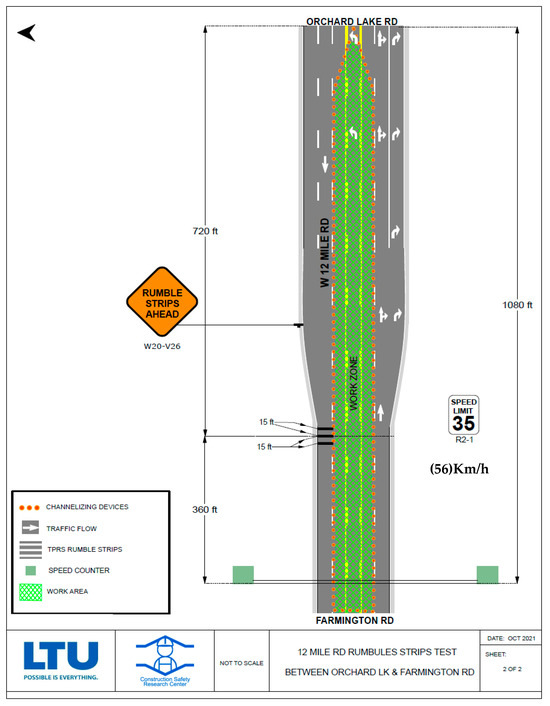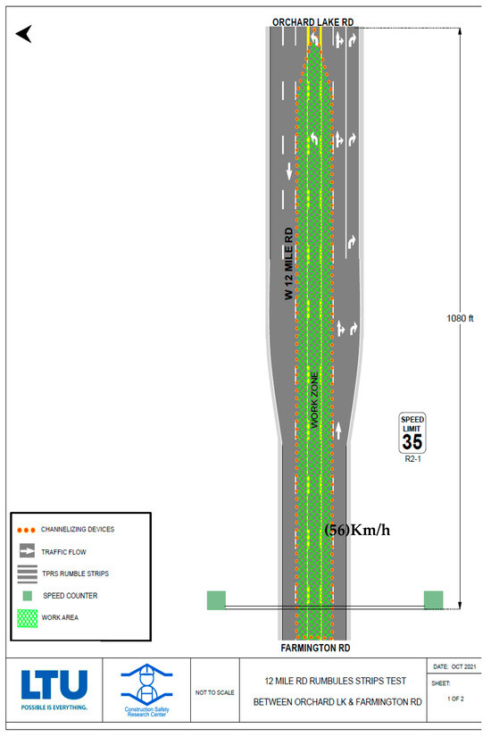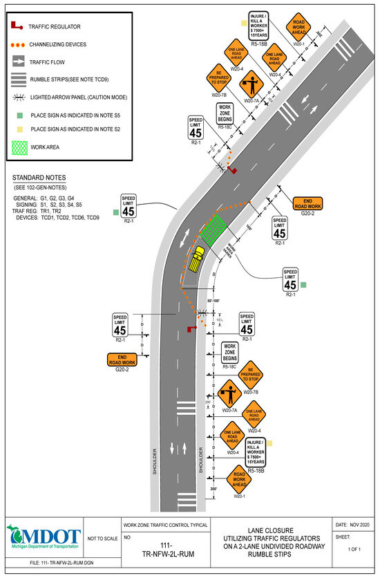 - Michigan Department of Transportation, MDOT. Work Zone Safety and Mobility Manual, WZSM, “Portable Temporary Transverse Rumble Strips—Non-Freeway” 6.01.18.C. 2021. Available online: https://www.michigan.gov/mdot/-/media/Project/Websites/MDOT/Business/Work-Zone-Mobility/Work-Zone-Safety-Mobility-Manual.pdf (accessed on 1 January 2020).