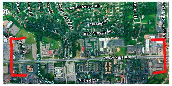 - The field test started on W 12 Mile Road was started at 10:00 a.m. without TPRSs. In the beginning, two speed counters were installed at 1080 feet from the Orchard Lake Road intersection on both traveling lanes. The speeds of moving cars were collected for an hour, until 11:00 a.m. Figure 3 shows the test configuration.