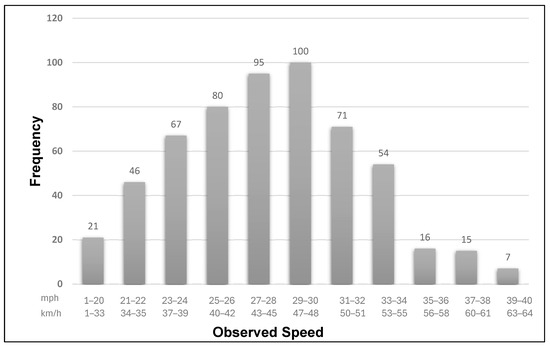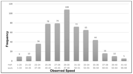 Control data contain traffic speed data recorded during the first hour (10:00 a.m. to 11:00 a.m.), including 532 vehicles with an average speed of 29.56 mph. The 85th percentile speed ranges from 33 to 34 mph, with an average 85th percentile speed of 33.5 mph. Traffic speed data between 10:00 a.m. and 11:00 a.m. without TPRSs are shown in Figure 5.