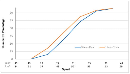 Figure 7 presents the empirical cumulative percentage distribution of car counts, alongside speed data, both with and without TPRSs. The results indicate that vehicles without TPRSs are more likely to travel at higher speeds. TPRSs have a noticeable impact, reducing the speed of drivers by roughly 2 mph (i.e., 3.2 km/h) at the 85th percentile. The 85th percentile speed ranges from 31.5 mph (i.e., 50.6 km/h) to 33.5 mph (i.e., 53.9 km/h). This reduction is consistent with the findings of [37], who reported a 1.4–2 mph (i.e., 2.2–3.2 km/h) reduction, and [16], who observed a 1.3 mph (i.e., 2 km/h) reduction. Other studies, such as [38,39], reported larger reductions, likely due to differences in methodologies, study durations, and speed limits. Thus, while our study aligns with previous research in terms of overall reduction, none have specifically addressed the impact on different vehicle types. Although the sample size for trucks was limited, it provided insight that TPRSs might not significantly affect truck speeds.