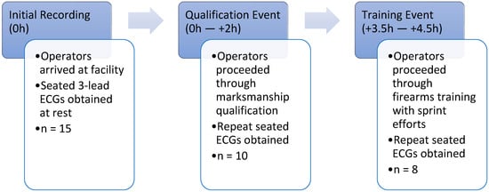 This research protocol was approved by the Messiah University Institutional review board (2019–2022) and the Bond University Research Ethics committee (2019–2022 amnd 2). All procedures were conducted in accordance with the Declaration of Helsinki of 1964 and its later amendments [42]. Data that were obtained both retrospectively and prospectively were combined for analysis. Specifically, the obstacle course was completed approximately 14 days prior to the ECG data collection. The methodology for the obstacle course, firearms qualification and training, and HRV data acquisition has been previously reported [43,44]. For HRV assessment, 3-lead electrocardiograms (ECGs) were collected at baseline (before qualification and training), after a firearms qualification course and then finally after a training exercise. See Figure 1 for additional detail on data collection timing. HRV was assessed as a dependent variable for linear regression modelling in which obstacle course time was the independent variable. Within-operator changes from baseline to post-qualification, and from baseline to post-training, were also assessed. HRV domains considered were those identified for occupational use by Sammito et al.: root-mean square of successive differences (RMSSD), standard deviation of all normal R-R intervals (SDNN), total spectral power (TP), low-frequency (LF), and high-frequency (HF) [45]. The non-linear indices SD1 (Poincare plot X–axis standard deviation) and SD2 (Poincare plot Y–axis standard deviation) were also considered as these are known robust HRV measures [21].