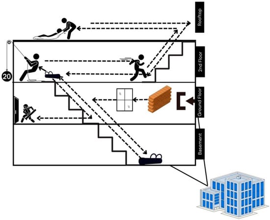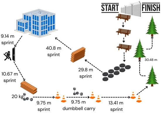 The occupational obstacle course began with an 8.83 m sprint. Next, personnel hurdled across three benches (each one meter tall) placed approximately 6.07 m apart. This was followed by stepping through a series of nine tires, then a 29.87 m sprint to a 1.82 m wall obstacle which needed to be bounded over. After this, personnel completed a 40.84 m outdoor sprint to enter the training facility building. Personnel then needed to clear a 1.23 m wall, exit a window, and proceed down a flight of stairs. Once personnel reached the base of the stairs, they acquired a tactical battering ram (~15 kg) and proceeded with the ram to the second story. Once there, personnel placed the ram on the floor, and pulled a commercial 20 kg weight plate from the ground up to the second story by pulling an attached rope. Personnel next ran to the opposite end of the training facility roof and dragged an 81 kg dummy placed in a Sked litter. Once returning from this, personnel descended back down to the second story. At this time, the battering ram was recovered, and personnel returned to the ground level. The battering ram was utilized to exit a blocked door. After exiting, personnel were to sprint 10.67 m to another 1.23 m wall. After clearing the wall, personnel lifted two 20 kg commercial dumbbells and carried them, weaving through two sets of six cones spaced 9.75 m apart. This was followed by a sprint to a final set of cones. Finally, to complete the course, personnel weaved again around a set of three trees (approximately 30 m total). Three minutes (180 s) was the maximum allowable time for completion. Personnel were recorded by the unit commander on a manual stopwatch with times rounded to the nearest whole second [43,44] (see Figure 2 and Figure 3 for further details).