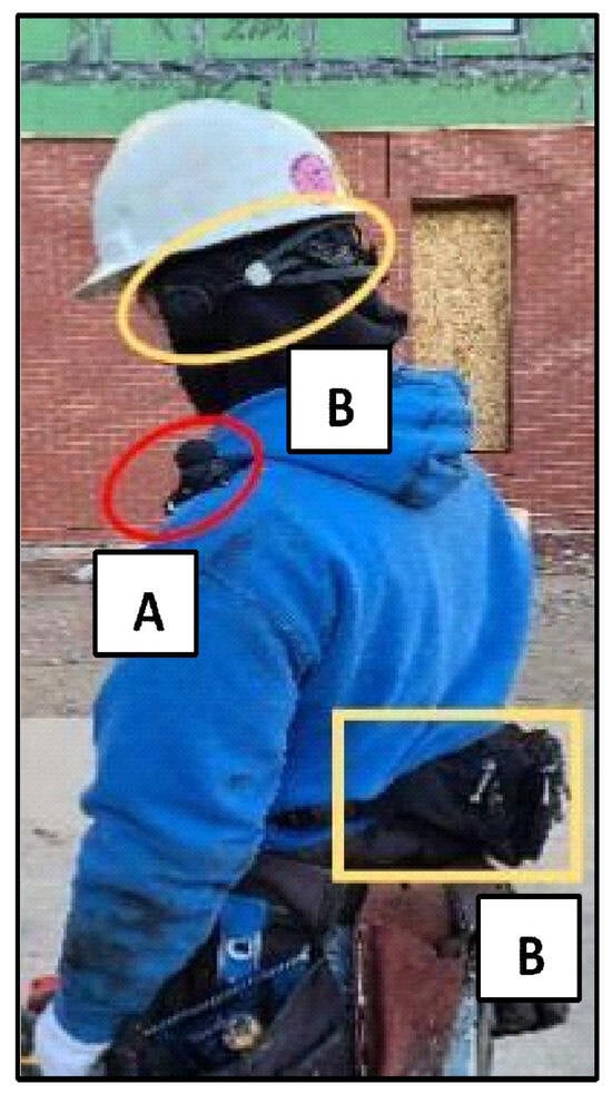 Figure 1 illustrates an example location of the dosimeter and the binaural devices. Depending on the handedness of the worker, the dosimeter was placed on the shoulder of the side of the working hand, presumably closer to the noise sources throughout the day. However, if the work analysis conducted before the measurements revealed that the work would involve using a particularly preferred shoulder, for example, for carrying materials throughout the day, the dosimeter was placed on the opposite shoulder.