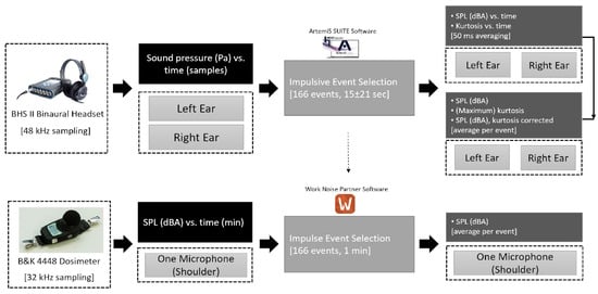 For dosimeter measurements, the segmenting process could not be conducted in the same way because dosimeter SPLs were available only after every one-minute segment. Instead, 166 dosimeter readings were identified, corresponding to one-minute segments that contained each of the impulsive events previously identified from the binaural measurements. This allowed for a comparison of the dosimeter (monaural) and left and right ear (binaural) SPLs for overlapping time periods. The time stamps of the dosimeter segments and their SPLs were identified offline using Work Noise Partner software and matched with the time stamps of the binaural recordings identified using ArtemiS SUITE software, version 15.5.