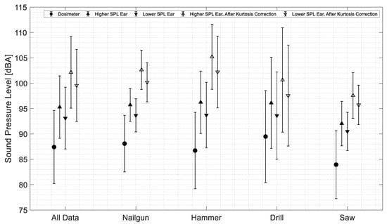 To address Objective 3, Figure 4 shows the data categorized according to the specific operating tool being used. Although the overall values differ across the categories, the trends within each category are similar to those for the combined data (leftmost cluster of points) in terms of the difference between dosimeter and binaural measurements and the SPL differences across ears. As expected, the kurtosis adjustment varies depending on the sound impulsiveness associated with a particular tool. Previously, kurtosis was used to assess the hazardousness of sound [,]. In our study, the hammer sound resulted in the greatest kurtosis adjustment and the highest adjusted SPL overall, suggesting it is more hazardous than the other three types of sound.