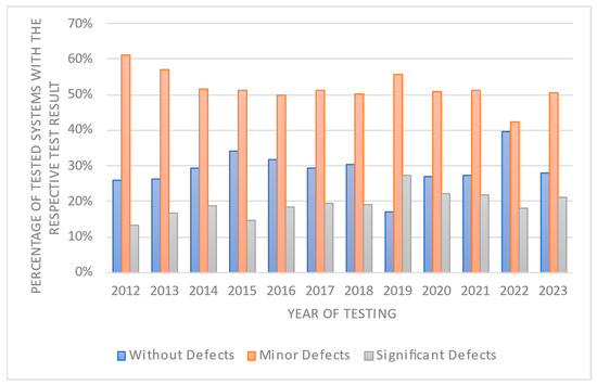 - Alarm devices: As systems age, particularly after 10 years of operation, the study shows a significant rise in defects in alarm devices, particularly acoustic signals. Therefore, inspection intensity for these components must increase with system age, with comprehensive inspections recommended no later than 10 years into the system’s operational life. This pattern is evident in Figure 3 and was confirmed by experts, indicating that prioritizing alarm device inspections in older systems can prevent critical failures. This is a direct proposal for optimizing inspections in older systems based on the study results.