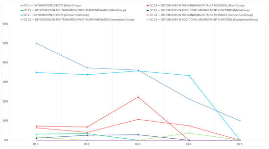- Contrary to this trend, there were defect categories whose probabilities of occurrence decreased to a greater or lesser extent with increasing system size. The corresponding trends are shown graphically in Figure 5. These specifically affected deficiencies were related to the technical documentation of the systems (DC.2), and others concerned the handling of fault messages (DC.14), the transmission of alarms (DC.15), and supplementary management functions (DC.16). According to the opinions of the experts, potential reasons for these effects are regarding the operating behavior of these systems. Fire alarm systems in the category RS.5 usually have professional operators or professional maintenance partners who provide additional technical care in the affected points—especially in the area of documentation. This effect can also be interpreted clearly from the figures. In total, 67% of the experts surveyed agreed with the mentioned trends and explanations while only 7% disagreed or could not confirm the trends out of their practical experience.