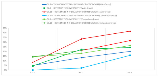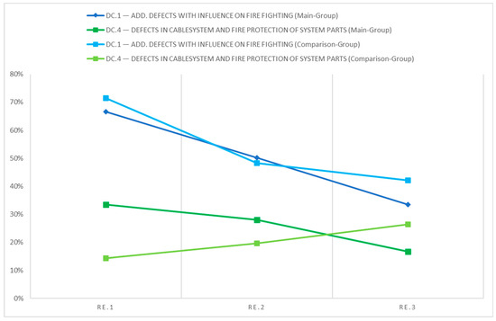 - This circumstance can, in turn, be explained by the installation regulations for fire alarm systems, in which, depending on the environmental conditions, higher requirements are placed on the laying of cables and wires. For example, higher-quality installation systems and types of cables, which are better protected against damage, are often used in such cases. The decreasing trends are shown in Figure 7. The diagram also shows that the evaluation of the comparative sample revealed that the trend for the defects in the cable system (DC.4) could not be verified. This is, therefore, more of a statistical fluctuation and not a relevant trend.