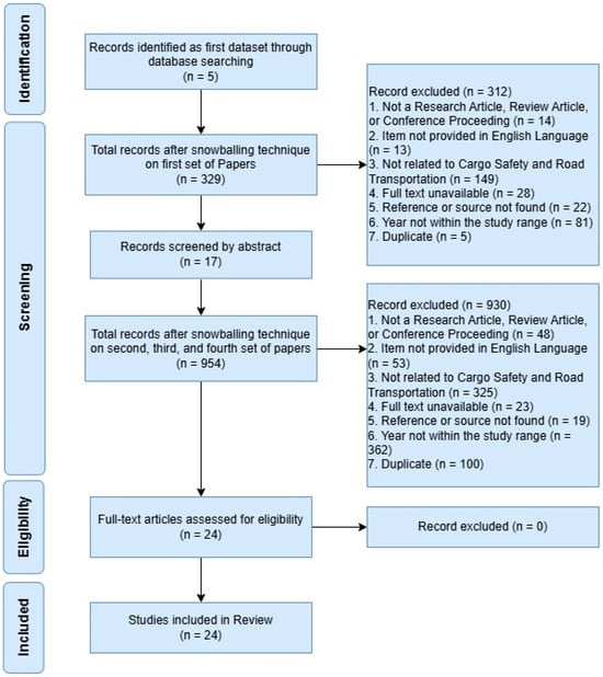 - The 24 full-text articles that passed the screening stage were assessed for eligibility based on the inclusion criteria (e.g., relevance to cargo loss risks, publication in English, research-based content).