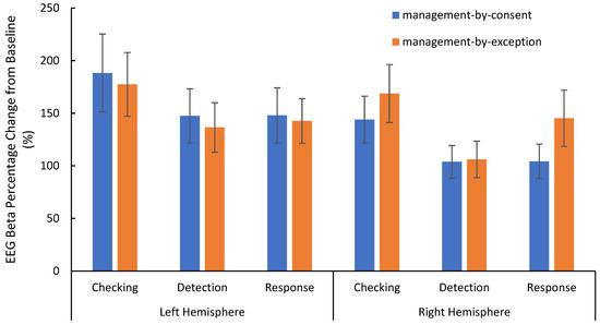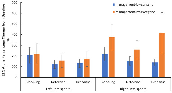 The EEG spectral frequency bands—theta, alpha, and beta—were analyzed separately. For each, we ran a 2 (LOA: management-by-consent and management-by-exception) × 3 (task type: checking, detection, and response implementation) × 2 (hemisphere: left and right) repeated-measures ANOVA. For the theta band, no significant main effect or interaction was revealed by the 2 × 3 × 2 ANOVA. For alpha power, a significant main effect was found for task type (F(1.68,52.19) = 4.96, p < 0.05, ɳp2 = 0.14). The detection task showed a smaller increase from baseline than the other two tasks (see Figure 3). Additionally, the interaction of the LOA and hemisphere was very close to significance (F(1,31) = 4.11, p = 0.05, ɳp2 = 0.12). In the right hemisphere, management-by-exception elicited a greater alpha increase for all three task types; however, such a trend was not observed in the left hemisphere. Effect sizes for the impact of the LOA on the right hemisphere alpha power were of small magnitude, ranging from 0.32 (detection) to 0.38 (response implementation). These findings are tentative because the p-value was just short of significance, but they suggest that cortical arousal and alertness in the right hemisphere were lower at the higher LOA.