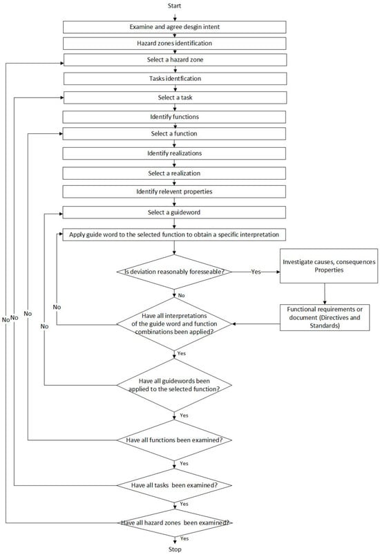 In the concept design stage, the function-centered design approach is dominant []. The functional requirements, including safety functions, are abstract. Correspondingly, function-centered hazard identification is naturally aligning the design intention for eliminating hazards that hinder its function realization. The other traditional hazard identification methods, such as FTA, failure mode and effect analysis (FMEA), and Hazard and Operability Studies (HAZOP), are not suitable for functional hazard identification. The detailed research on this argument can be found in the literature []. Based on the risk assessment framework in ISO 12100 and the principles in HAZOP [,], F-CHIA is proposed. The features of F-CHIA are: (i) It can be applied at all stages of the life cycle, (ii) It can be applied for complex systems, (iii) It can analyze functional requirements for each foreseeable hazard in terms of functions, (iv) It can provide systematic hazard identification on the functional level, and avoid repetitions of works (v) It integrates the risk assessment elements in the ISO 12100 standard, which means it follows the recommendations by standards.