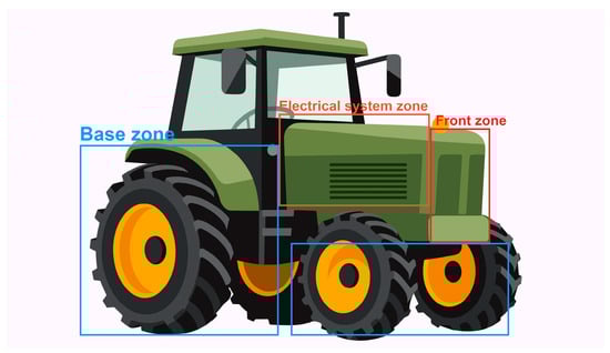 Illustration of the hazard zones on a schematic diagram of an agriculture tractor. The schematic diagram of the tractor is taken from vecteezy.com (accessed on 5 December 2024). Three hazard zones directly connected to the tractor are shown in the figure: Base, Electrical system, and Front zones. The surrounding zone, which is not connected to the tractor’s physical components, refers to the space around the tractor and is not shown in the figure.