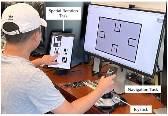 47]. The shapes and selection process simulate the spatial awareness required in high-demand environments, helping to evaluate participants’ visual–spatial processing while managing the navigation task. Participants selected their responses by tapping the touchscreen, and their accuracy in this task contributed to the overall assessment of multitasking performance. Previous research has demonstrated the effectiveness of the mental rotation paradigm in evaluating spatial abilities in dynamic environments, such as interpreting complex 3D geovisualizations [