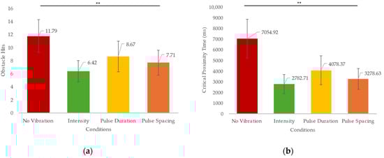 Figure 4) between the vibrotactile feedback conditions, notable improvements were found in terms of the reduced obstacle collisions and minimized critical proximity time with the obstacles (