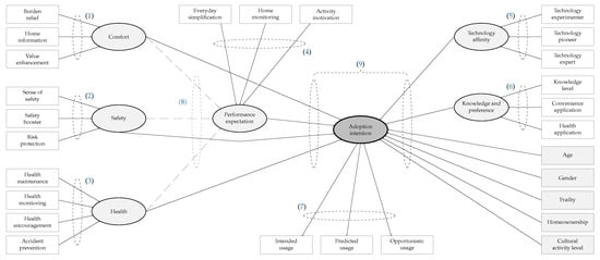 - Personal characteristics and SH adoption intention may correlate positively or negatively.Personal characteristics, such as age, gender, income, education level, and technology affinity, influence the intention to adopt SH technology. Using the example of age, research has shown that these characteristics can positively or negatively affect adoption decisions. While younger adults often show higher adoption intentions [81], Shin et al. [82] and Klobas et al. [68] found higher adoption rates among older adults due to their increased willingness to share personal data in SH health settings.