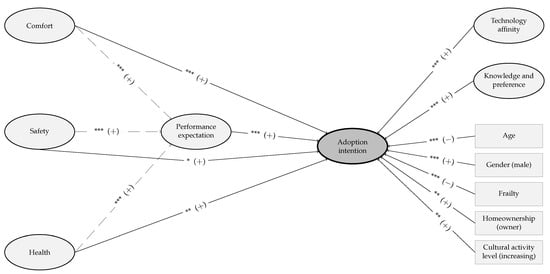 In Table 5, we report the results of the regression model in Equation (8). It shows how perceived benefits related to comfort, safety, and health benefits are associated with performance expectations. The three benefits are significant for the overall perceived usefulness of the technology. Comfort considerations seem most relevant, followed by safety and health benefits.