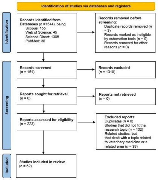 It is important to note that the initial search retrieved 1544 studies, which were then subjected to a review of their titles and contents, applying exclusion criteria based on the PRISMA Statement as shown in the flow diagram below (Figure 1). This process considered the relevance to the research topic and the context in which the study was conducted. Only research relevant to the topic under investigation was included in this study.