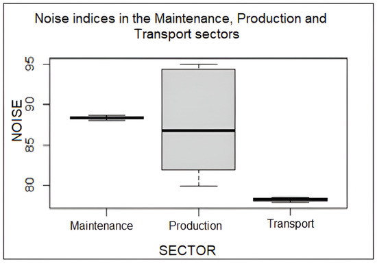 As shown in Table 3, the noise levels measured in the work environment exceed the tolerance limits established by the Regulatory Standards. The sectors under investigation were grouped into three categories: Maintenance, Production, and Transportation. The box plot displays the results obtained from ANOVA for these sectors, and the Tukey’s test was applied to identify differences between the means (Figure 3). The results indicate a significant difference between the groups, with the Transportation sector exhibiting the lowest noise levels, followed by the Maintenance sector, and then the Production sector.