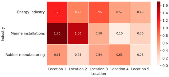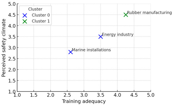 The cluster analysis categorized worker perceptions of the safety climate into two distinct groups. Cluster 0 included the energy and maritime logistics sectors, where the workers shared concerns about the adequacy of training quality and safety protocol implementation. Cluster 1 consisted of the rubber manufacturing sector, where the workers reported a more favorable safety climate characterized by frequent safety briefings and higher management investment in safety measures. Figure 3 displays these findings, revealing that the energy and maritime logistics sectors present lower worker confidence in safety training, management commitment, and overall workplace risk awareness. The rubber manufacturing sector demonstrates a more structured safety culture characterized by frequent training programs and systematic risk assessments.