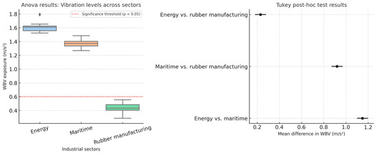 Figure 2 presents the results of the ANOVA and Tukey post hoc tests, illustrating differences in WBV exposure across the industrial sectors: blue for energy, brown for maritime, and green for rubber manufacturing. The statistical analysis confirmed substantial differences in WBV exposure between the sectors.