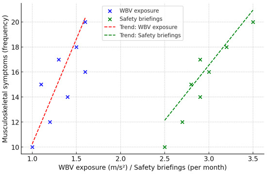 These findings demonstrate that WBV risk is influenced not only by exposure intensity but also by task design, ergonomic conditions, and the implementation of safety protocols. A structured approach combining vibration mitigation technologies with task redesign could offer better long-term protection. Adjusting work schedules or introducing job rotation strategies may help reduce prolonged exposure without affecting productivity. Even in structured environments, exposure reduction efforts should be guided by data. Integrating training outcomes with real-time exposure tracking can help assess whether interventions effectively reduce worker risk. The role of safety culture in mitigating WBV exposure is well documented, with research indicating that industries with robust safety policies report lower incidence rates of WBV-related MSDs [27]. Furthermore, advancements in digital monitoring and automated safety assessments allow workplaces to align training programs with real-time risk levels, ensuring interventions remain relevant and adaptable to changing exposure conditions.