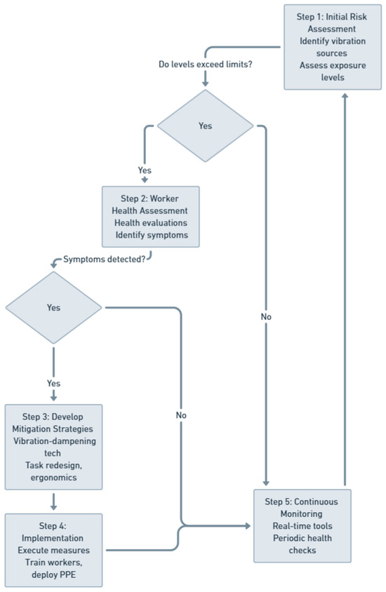 A decision flowchart was created to systematically identify hazardous areas, assess workplace conditions, and prioritize interventions. The first step involves evaluating vibration exposure levels against established safety thresholds, followed by an assessment of organizational factors such as training frequency, equipment maintenance, and management practices. This structured framework supports interventions in addressing physical and systemic risks appropriately.