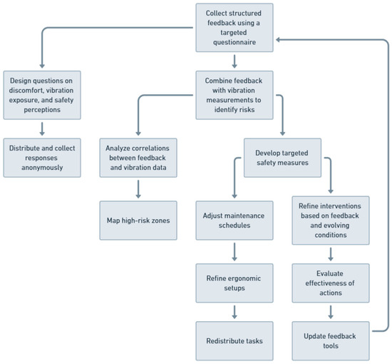 Integrating worker feedback improves the effectiveness of safety interventions outlined in the decision-making flowchart. By aligning safety measures with workplace conditions, this approach identifies risks that standard assessments might overlook. Automated reporting systems link exposure measurements with real-world working conditions, supporting timely and data-driven interventions. A structured methodology is used to collect, analyze, and apply worker input, combining subjective experiences with objective vibration data to refine intervention strategies.