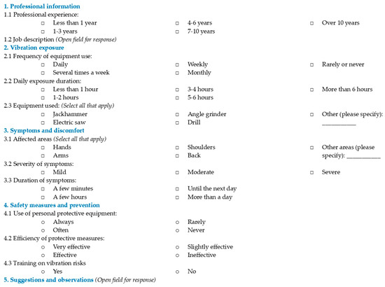 The questionnaire serves as the primary feedback tool, focusing on key aspects of worker experience. By structuring questions around specific tasks and exposure patterns, it ensures that data collection aligns with real workplace conditions. It evaluates physical discomfort by prompting workers to specify affected body areas and rate severity on a scale of one to five. Additionally, it gathers information on exposure conditions, including the duration and frequency of tasks involving vibrating equipment. This structured approach supports trend analysis, helping identify recurring issues that might otherwise go unnoticed. The questionnaire also assesses the existing safety measures by capturing worker perceptions regarding protective equipment and workstation adjustments. The incorporation of targeted questions about the impact of interventions helps organizations refine their safety strategies on the basis of real worker experiences rather than assumptions. The format is designed for clarity and ease of use, ensuring accessibility while maintaining the depth of responses necessary for meaningful analysis. Mobile-friendly digital forms could further increase response rates and improve data accuracy. Digital versions of the questionnaire simplify distribution and data processing, enabling the efficient aggregation of responses. Automated analytics tools could be integrated to highlight hazardous areas and prioritize intervention strategies on the basis of the reported discomfort levels. Figure 8 presents an excerpt from the worker feedback questionnaire, highlighting the structured sections tailored to capture insights into vibration exposure, physical discomfort, and workplace safety practices. Combining this feedback with real-time exposure monitoring can refine predictive safety models, allowing organizations to take preventive action before risks escalate. By integrating multiple data sources, this approach improves the accuracy and reliability of workplace assessments, supporting the ongoing refinement of safety interventions.
