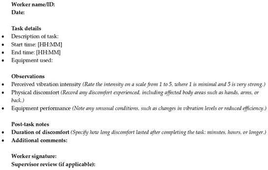 The daily work journal complemented the questionnaire by capturing task-specific data in real time, including the start and end times of activities involving vibrating equipment, equipment performance variations, and worker-reported discomfort. By incorporating timestamps and automated logging, this tool can improve exposure tracking, reducing reliance on worker recall. This tool introduces a temporal dimension to the feedback process, revealing patterns that periodic surveys might overlook. It also supports trend analysis by identifying exposure spikes linked to specific work shifts, equipment uses, or operational conditions. Standardized templates maintain consistency in data collection and simplify trend analysis, helping to detect exposure risks and maintenance inefficiencies. Figure 9 presents an excerpt from the daily work journal, illustrating its structured format for recording real-time observations on activity durations, equipment conditions, and worker-reported discomfort. Integrating this journal into a centralized monitoring platform could further expand its utility, allowing automatic risk alerts and improving response time.